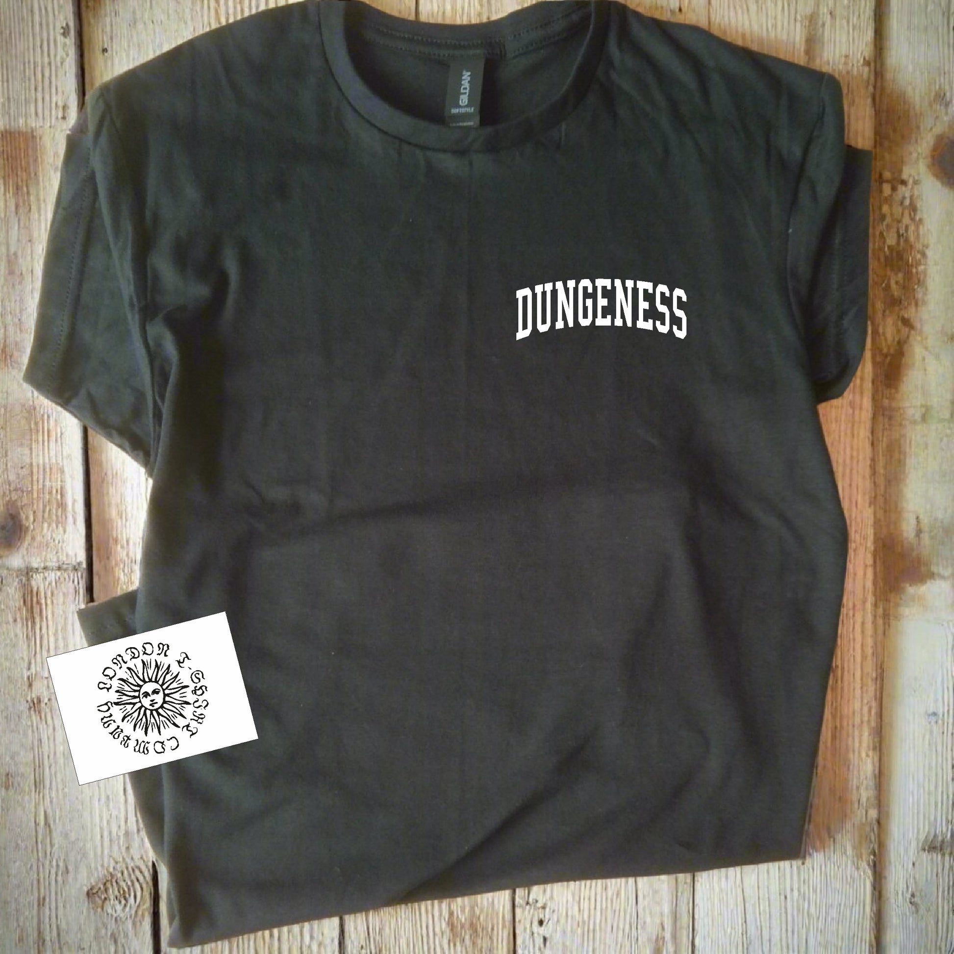 Located in Kent, lies the mysterious almost desert like charm of Dungeness. Simple souvenir style design pocket logo top.